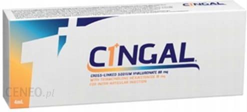 Cingal 22mg/1ml 1 ampułko-strzykawka 4ml. Cingal usieciowany kwas hialuronowy z heksacetonidem triamcynolonu jako substancją pomocniczą. Cingal jest białawym, nieprzezroczystym, jałowym, przeznaczonym do jednorazowego użytku roztworem usieciowanego żelu kwasu hialuronowego (HA) i heksacetonidu triamcynolonu (TH) – kortykosteroidu – jako substancji pomocniczej. Cingal jest substancją biokompatybilną i niepirogenną. Pomiędzy zawartym w preparacie Cingal usieciowanym kwasem hialuronowym i heksacetonidem triamcynolonu nie zachodzi fizyczna ani chemiczna interakcja, ponieważ zmikronizowane cząstki heksacetonidu triamcynolonu są zawieszone w wiskoelastycznym żelu kwasu hialuronowego i pozostają w produkcie jako osobna faza stała.