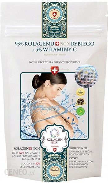Kolagen NCN – Młodość 100gProducent: Kolagen NCN TO W 100% NATURALNY ŁATWO PRZYSWAJALNY KOLAGEN RYBI, ZGODNY W 80% Z LUDZKIM DNA, CZYSTY: BEZ KONSERWANTÓW, BEZ BARWNIKÓW, BEZ AROMATÓW, BEZ GMO.Suplement diety – Witamina C: • Pomaga w produkcji kolagenu w celu zapewnienia prawidłowego funkcjonowania:- Skóry – poprawa elastyczności, nawilżenia i jędrności, dająca efekt naturalnego liftingu;skóra mniej podatna na powstawanie zmarszczek i przebarwień, poprawa kolorytu skóry- Kości- Chrząstek- Zębów- Dziąseł- Naczyń krwionośnych• Zwiększa przyswajanie żelaza• Pomaga w regeneracji zredukowanej formy witaminy E• Pomaga w ochronie komórek przed stresem oksydacyjnym• Pomaga w utrzymaniu prawidłowych funkcji psychologicznych• Pomaga w prawidłowym funkcjonowaniu:- Układu nerwowego- Układu odpornościowegoSkładniki: hydrolizat kolagenu rybiego (95%), kwas L-askorbinowy (5%)Zalecana porcja do spożycia niezbędna dla uzyskania korzystnego działania:1 raz dziennie po dwie łyżeczki.Nie należy przekraczać zalecanej porcji do spożycia w ciągu dnia.Sposób użycia:Dwie łyżeczki proszku rozpuścić w szklance letniej wody, soku lub mleka.Przechowywać w sposób niedostępny dla małych dzieci.Po otwarciu opakowania spożyć w ciągu 30 dni.Przechowywać w ciemnym, suchym i chłodnym miejscu.Informacje dodatkowe:Preparat nie może być stosowany jako substytut zróżnicowanej diety i zdrowego stylu życia. Należy pamiętać, że dla osiągnięcia korzystnych rezultatów, preparat powinien być spożywany w ramach zróżnicowanego i zrównoważonego sposobu żywienia oraz zdrowego trybu życia.Masa netto: 100g