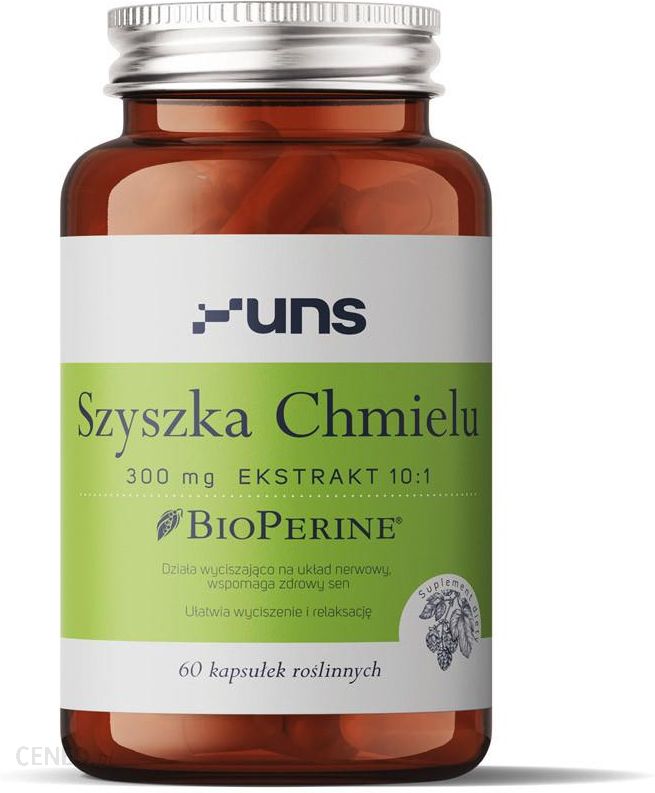 Właściwości UNS Szyszka Chmielu 300mg Ekstrakt 10:1 60 wegańskich kapsułek, która wykazuje działanie uspokajające:Działa wyciszająco na układ nerwowy, wspomaga zdrowy senUłatwia wyciszenie i relaksacjęWykazuje działanie rozkurczowe, wspomaga trawieniePomaga w łagodzeniu objawów przekwitania takich jak: uderzenia gorąca, niepokój, brak koncentracji, zmienność nastrojów, zaczerwienienie twarzy czy wzmożona potliwośćSzyszka Chmielu 300mg Ekstrakt 10:1 60 wegańskich kapsułek od UNS – zioło na dobry sen!UNS Szyszka Chmielu 300mg Ekstrakt 10:1 to ziołowy suplement diety zawierający naturalny ekstrakt z szyszek chmielu (Humulus lupulus), w ilości 300 mg i pieprzu czarnego w ilości 3 mg w każdej kapsułce. Produkt został wzbogacony o BioPerine®, która zwiększa skuteczność składników ziołowych oraz wspiera trawienie. Do produkcji zostały wykorzystane ekstrakty najwyższej jakości. DER (Drug Extract Ratio) jest to wskaźnik ilości surowca roślinnego do ilości otrzymanego przetworu roślinnego. Preparat Szyszki chmielu + Bioperine to ekstrakt 10:1 z szyszek chmielu oraz ekstrakt 50:1 z owoców pieprzu czarnego. Dużym plusem są kapsułki roślinne, które bezpiecznie mogą stosować wegetarianie oraz weganie ponieważ nie zawierają składników pochodzenia zwierzęcego. Kapsułki zapakowane są w szklany słoiczek, który nadaje się do recyklingu. Clean label – zgodnie z tym trendem został stworzony produkt Szyszka chmielu + Bioperine, co oznacza, iż nie zawiera on substancji wypełniających, barwników ani konserwantów. Produkt jest pozbawiony zanieczyszczeń co gwarantują wyniki badań wykonane przez akredytowane laboratorium. Suplement diety wyprodukowany z zachowaniem najwyższych standardów GMP i HACCP.Stosowanie UNS Szyszka Chmielu 300mg Ekstrakt 10:1 wykazuje skuteczne działanie uspokajające, dlatego sprawdzi się u osób narażonych na stres, ze stanami lękowymi i mającym problemy ze snem. Pomocna będzie również w dolegliwościach ze strony układu pokarmowego i trawiennego. Szyszka chmielu korzystnie działa również na woreczek żółciowy i żołądek, zwiększa wydalanie moczu. Może być stosowana w przypadku przewlekłego nieżytu przewodu pokarmowego i w celu ochrony przed wolnymi rodnikami, odpowiedzialnymi za przedwczesne starzenie się organizmu.Sposób użycia Szyszka Chmielu 300mg Ekstrakt 10:1 UNS 60 wegańskich kapsułek:Spożywać 1 porcję (1 kapsułka) dziennie, popijając wodą.UWAGA!!! Nie należy przekraczać zalecanej dziennej porcji do spożycia. Produkt nie może być stosowany przez osoby uczulone na którykolwiek z jego składników. Przechowywać w miejscu niedostępnym dla małych dzieci. Przechowywać w miejscu suchym w temperaturze pokojowej w szczelnie zamkniętych opakowaniach.Składniki Szyszka Chmielu 300mg Ekstrakt 10:1 UNS 60 wegańskich kapsułek:Wielkość opakowania: 60 kapsułekWielkość porcji: 1 kapsułkaIlość porcji w opakowaniu: 60ekstrakt 10:1 z szyszek chmielu (Humulus lupulus), mąka ryżowa, BioPerine® – ekstrakt 50:1 z owoców pieprzu czarnego (Piper nigrum) standaryzowany na 95% piperyny, kapsułka celulozowa – hydroksypropylometylocelulozaZawartośćW 2 kapsułkach%RWS*Ekstrakt z szyszek chmielu300 mg*BioPerine® ekstrakt z owoców pieprzu czarnego3 mg*w tym piperyna2,85 mg**%RWS – referencyjna wartość spożycia