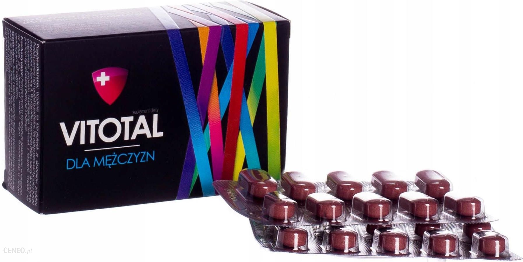 Suplement diety Vitotal dla mężczyzn, kórego składniki pomagają w utrzymaniu prawidłowego poziomu testosteronu we krwi (cynk), prawidłowym funkcjonowaniu mięśni (magnez, witamina D), prawidłowej syntezie białka (cynk, magnez), utrzymaniu prawidłowych funkcji poznawczych (cynk, jod, żelazo, żeń-szeń), oraz przyczyniają się do zmniejszenia uczucia zmęczenia i znużenia (foliany, kwas foliowy, kwas pantotenowy, magnez, niacyna, ryboflawina, witamina B12, witamina B6, witamina C, żelazo, żeń-szeń, mate), prawidłowym funkcjonowaniu układu odpornościowego (cynk, foliany, kwas foliowy, miedź, selen, witamina A, witamina B12, witamina B6, witamina C, witamina D, żelazo, żeń-szeń, imbir),prawidłowym funkcjonowaniu układu nerwowego (biotyna, jod, magnez, miedź, niacyna, ryboflawina, tiamina, witamina B12, witamina B6, witamina C) i utrzymaniu prawidłowych funkcji psychologicznych (biotyna, foliany, kwas foliowy, magnez, niacyna, tiamina, witamina B12, witamina B6, witamina C), prawidłowym funkcjonowaniu serca (tiamina, imbir, mate), utrzymaniu prawidłowego metabolizmu węglowodanów (cynk) i prawidłowego poziomu glukozy we krwi (chrom, żeń-szeń), utrzymaniu prawidłowego widzenia (cynk, ryboflawina, witamina A).