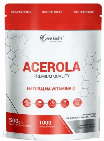 Acerola Naturalna Witamina C w proszku to suplement diety zawierający 100% ekstrakt z aceroli w czystej postaci. Acerola to owoc będący naturalnym źródłem witaminy C. Witamina C pomaga w utrzymaniu prawidłowego funkcjonowania układu odpornościowego w trakcie intensywnych ćwiczeń fizycznych i po nich. Pomaga witamina C pomaga w prawidłowej produkcji kolagenu w celu zapewnienia prawidłowego funkcjonowania naczyń krwionośnych, kości, zębów, dziąseł i skóry. Wspomaga ochronę prawidłowego funkcjonowania układu odpornościowego. Ponadto, witamina C pomaga w regeneracji zredukowanej formy witaminy E oraz zwiększa przyswajanie żelaza.Zastosowanie: uzupełnienie diety w witaminę C.Zalecane spożycie: zmieszać 0,5g proszku (0,5 miarki) z 200ml wody. Do odmierzenia porcji należy stosować miarkę dołączoną do opakowania.Składniki: 100% Acerola (Malpighia glabra).1 porcja (0,5g proszku) zawiera: ekstrakt z Aceroli 500mg (156%)*, w tym 125mg witaminy C (25%)*.*RWS — Referencyjna Wartość Spożycia.Przeciwwskazania: nie stosować u osób uczulonych na jakichkolwiek składnik preparatu. Kobiety w ciąży i karmiące piersią, osoby poniżej 18 roku życia oraz osoby chore powinny skonsultować się z lekarzem przed zażyciem preparatu.Ważne wskazówki:Suplementy diety nie mogą być stosowane jako substytut (zamiennik) zróżnicowanej diety.Nie należy przekraczać zlecanej do spożycia porcji w ciągu dnia.Suplementy diety powinny być przechowywane w sposób niedostępny dla małych dzieci.Przechowywać w chłodnym i suchym miejscu.Produkt wolny od GMO.Odpowiedni dla wegan i wegetarian.Produkt bez skrobi, bez soli, bez cukru, nie zawiera glutenu, jaj, soi, białka mleka i laktozy.Do diagnostyki lub leczenia należy skonsultować się z lekarzem.W przypadku wystąpienia niepożądanych objawów należy przerwać stosowanie i skonsultować się z lekarzem.Ilość netto: 500g.Producent:WISH Group Tomasz Kaczmarczyk,Bluszczowa 17A,30-439 Kraków.